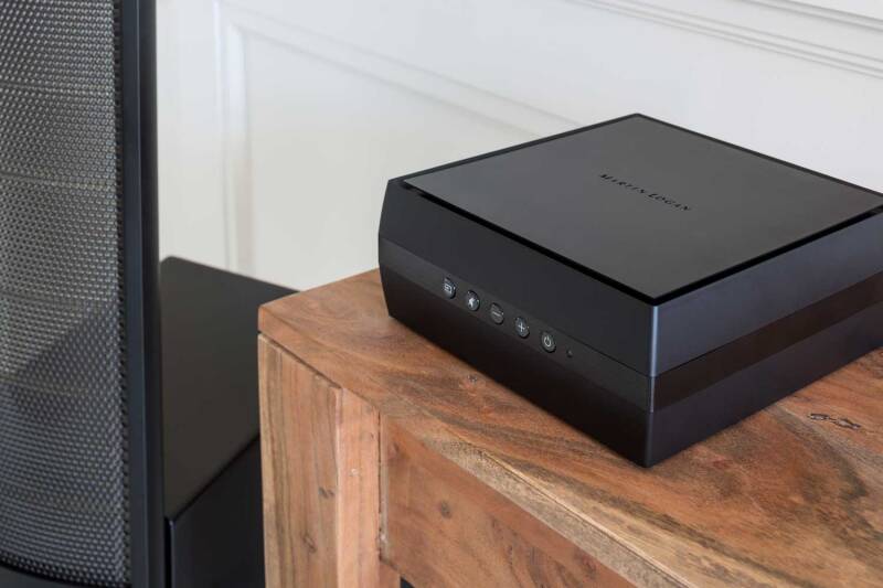 Martin Logan Forte Wireless Streaming Amplifier: the Forte is a surprising departure from the company's aesthetic; it's all-black plastic box ( 202 x 82 x 212 mm ) barely bigger than a college textbook.
