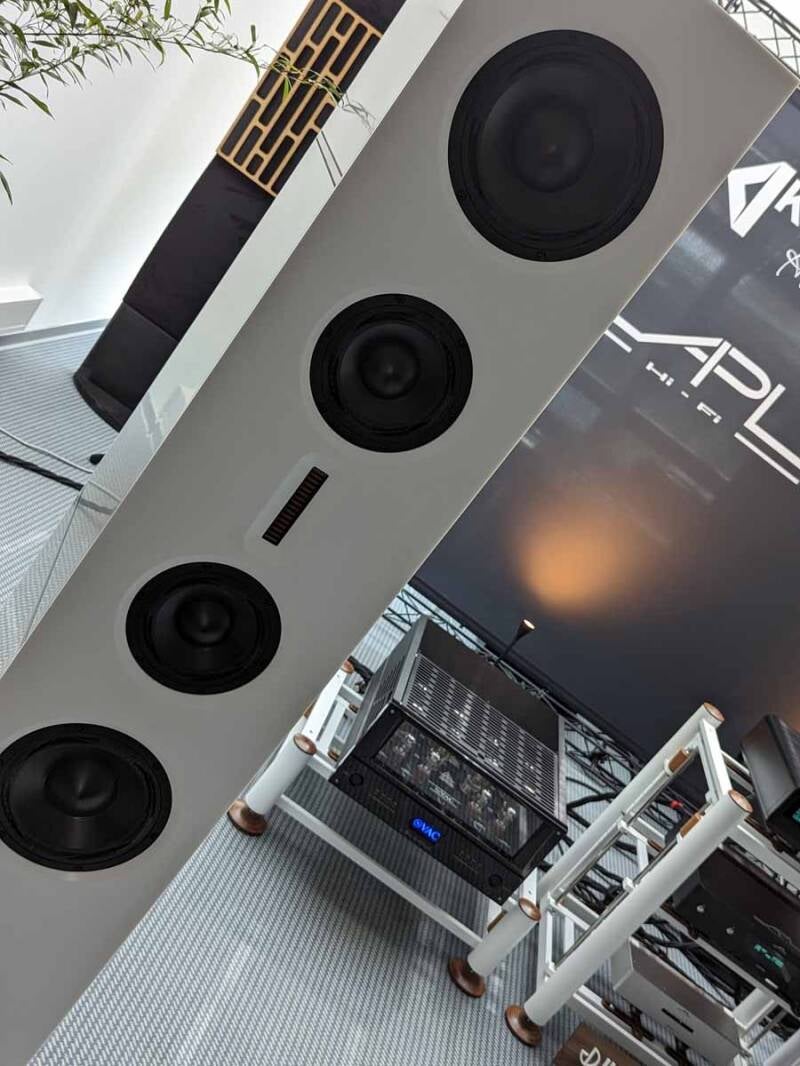 KROMA full system at the High End Munich 2023 : Kroma Mercedes loudspeaker, Amplifier VAC Master 300 Monoblock, VAC Master Preamp with Phono, D/A Converter APL DSD-GR, Streamer APL DNP-SE, Turntable TT TechDas Air Force V, Cables Ikigai Kinzan, Audiorack Artesania Exoteryc, Phiton Resonators.
